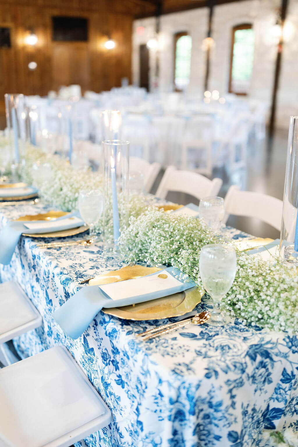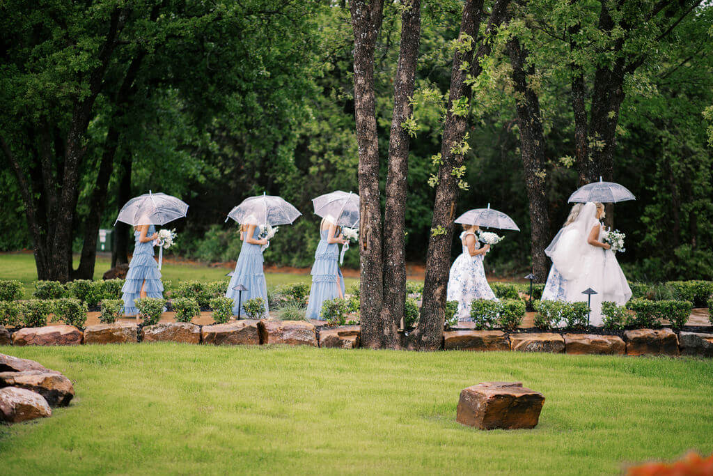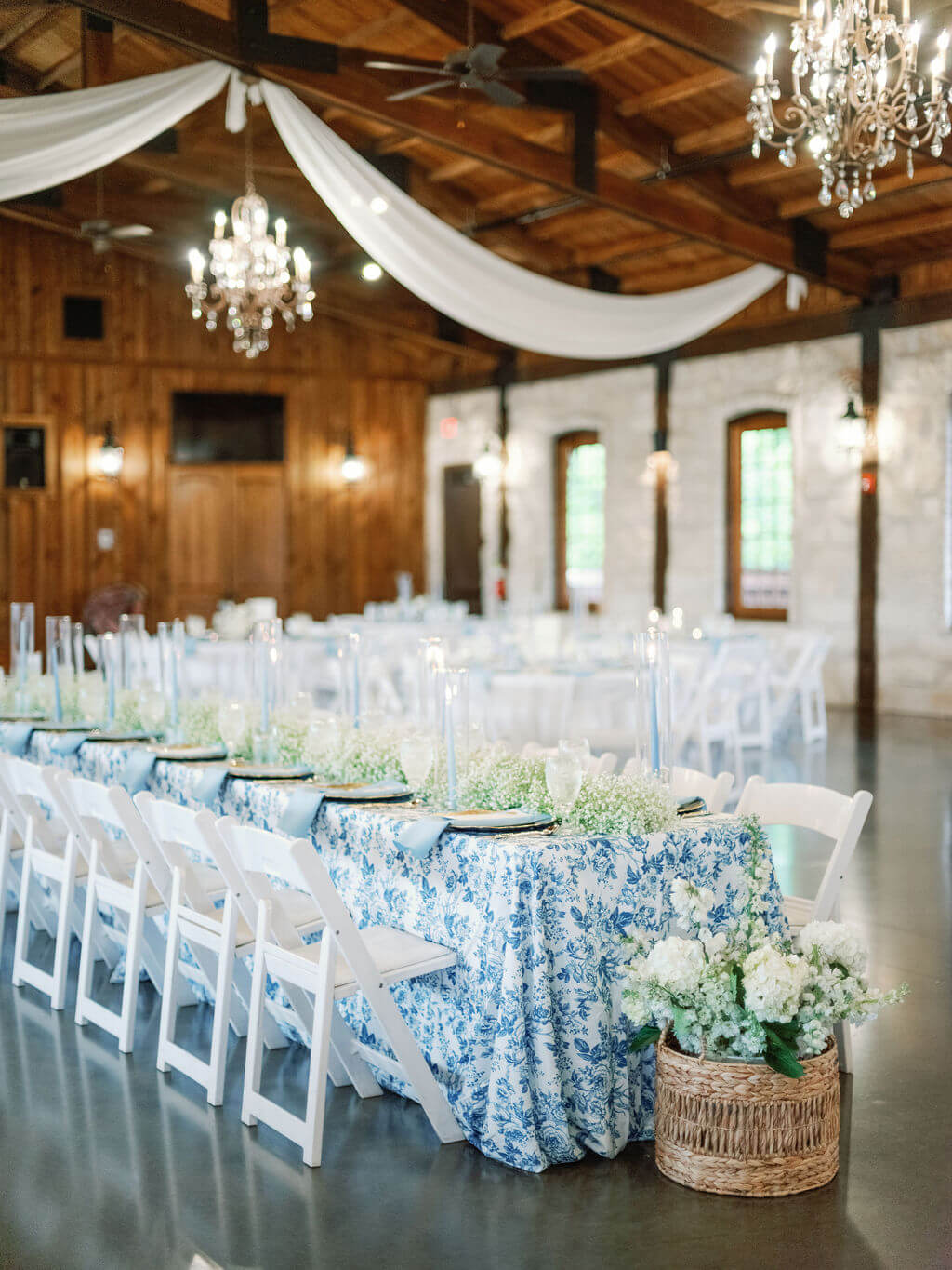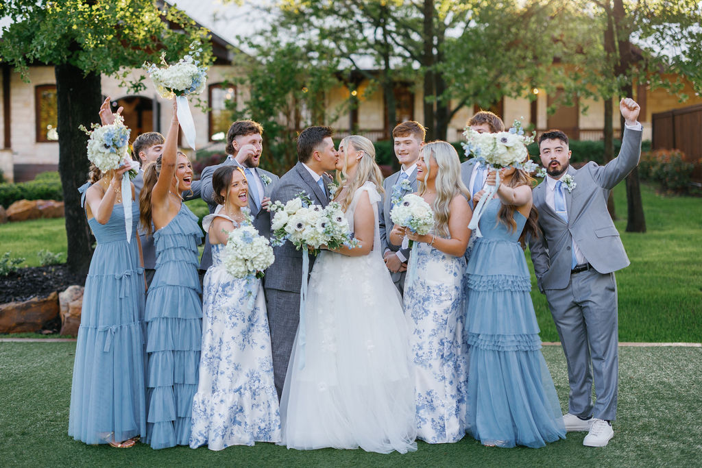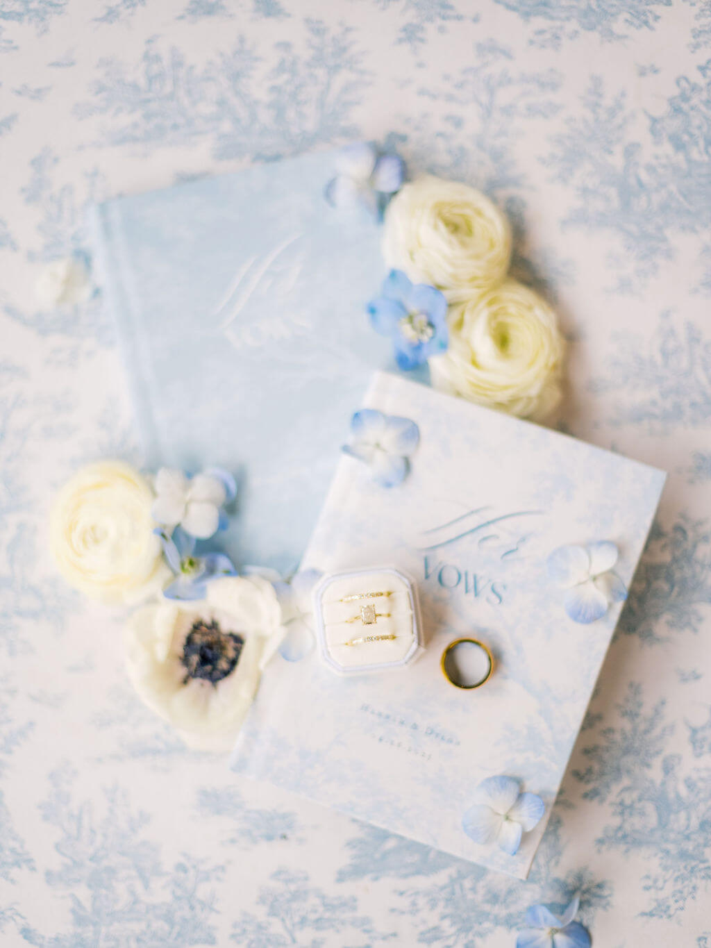 When it came time to start planning, Hannah leaned fully into the experience, drawn to every detail from the very beginning. Aurora Grove at The Springs in Norman was the first and only venue they toured, and it felt immediately like it was the place for them. The space reflected both of their personalities and the rest fell into place with ease. Hannah found her gown at Chantilly, and together they had already chosen rings that felt true to them. Their vision took shape around a French-inspired aesthetic, something soft and romantic, grounded in spring. Shades of blue layered with white and gold created a palette that felt both refined and whimsical.