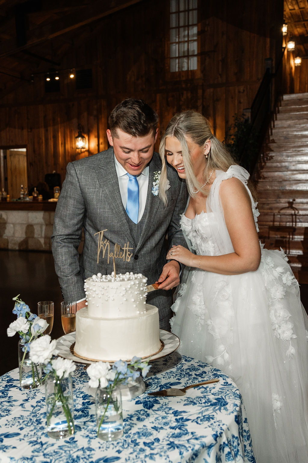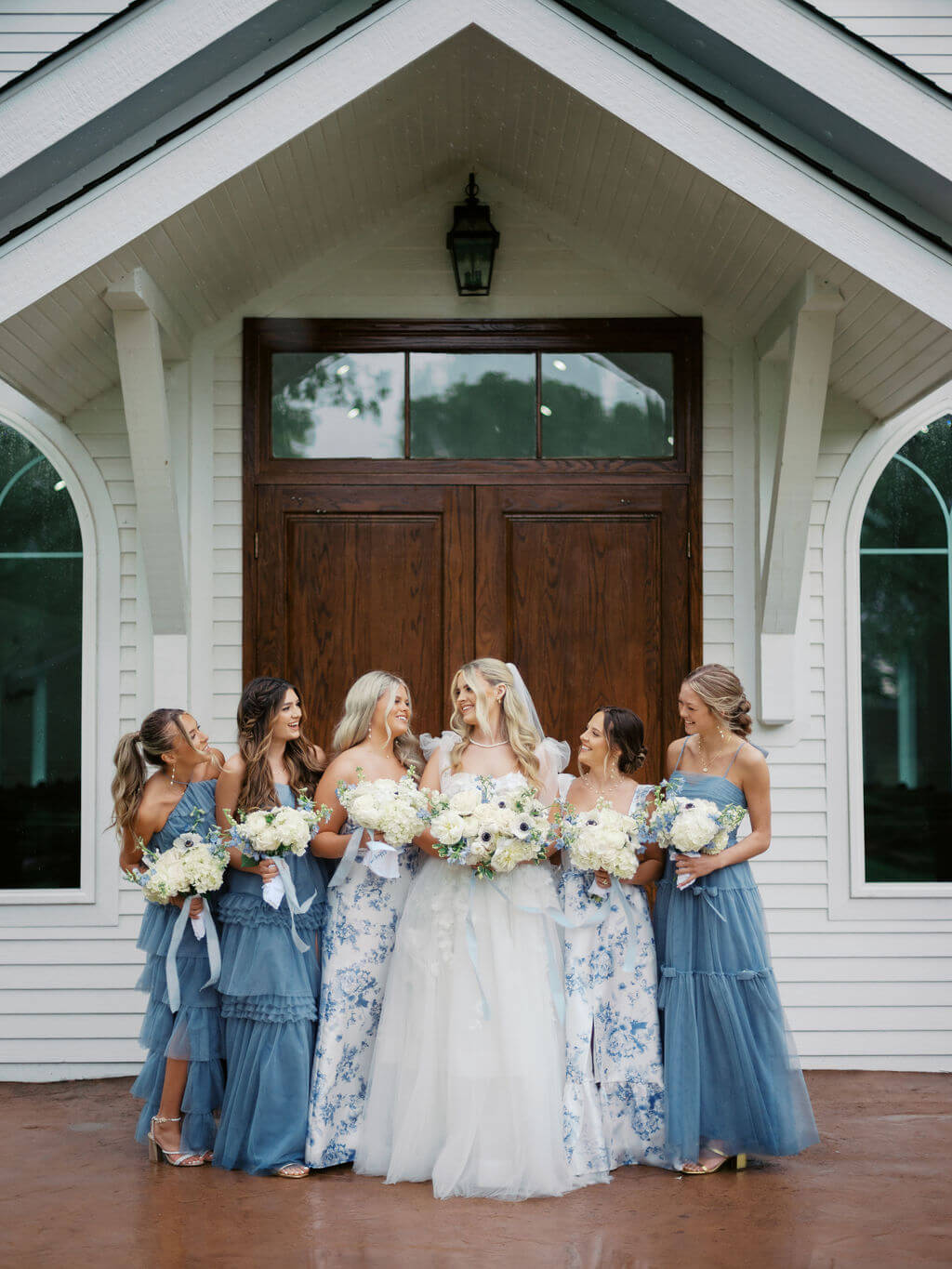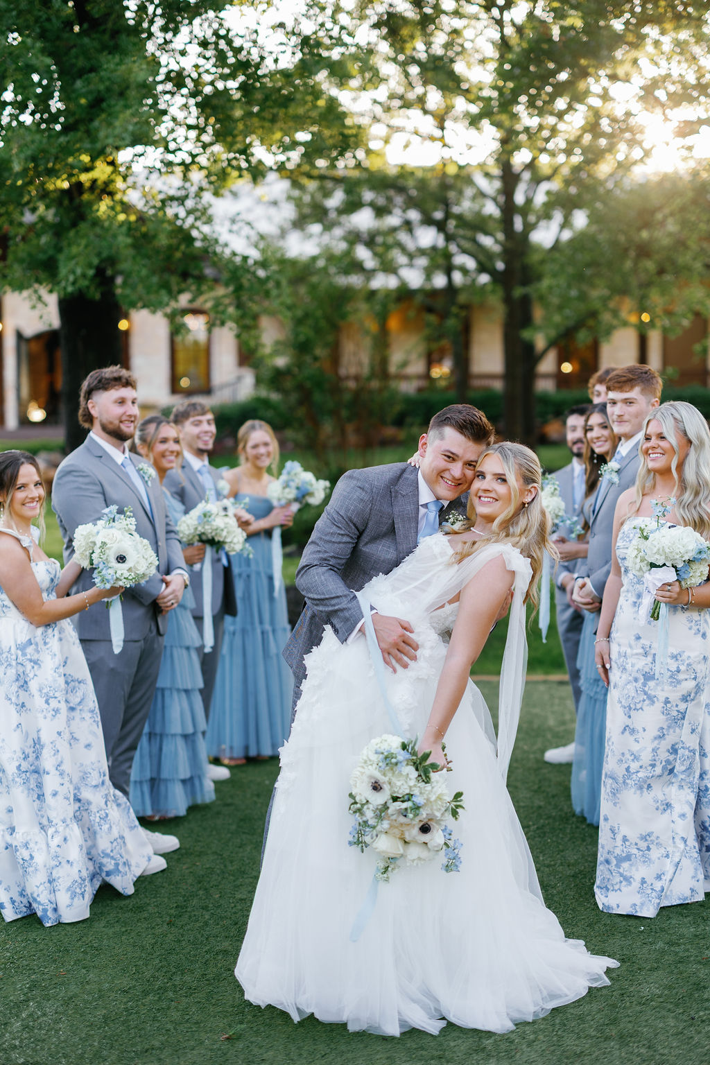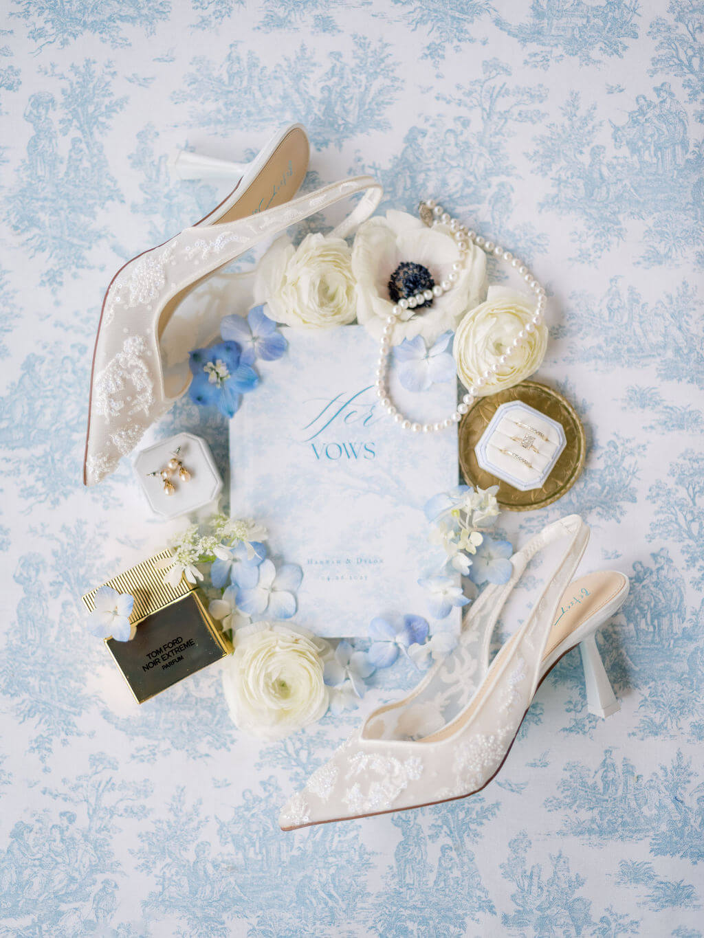 When it came time to start planning, Hannah leaned fully into the experience, drawn to every detail from the very beginning. Aurora Grove at The Springs in Norman was the first and only venue they toured, and it felt immediately like it was the place for them. The space reflected both of their personalities and the rest fell into place with ease. Hannah found her gown at Chantilly, and together they had already chosen rings that felt true to them. Their vision took shape around a French-inspired aesthetic, something soft and romantic, grounded in spring. Shades of blue layered with white and gold created a palette that felt both refined and whimsical.