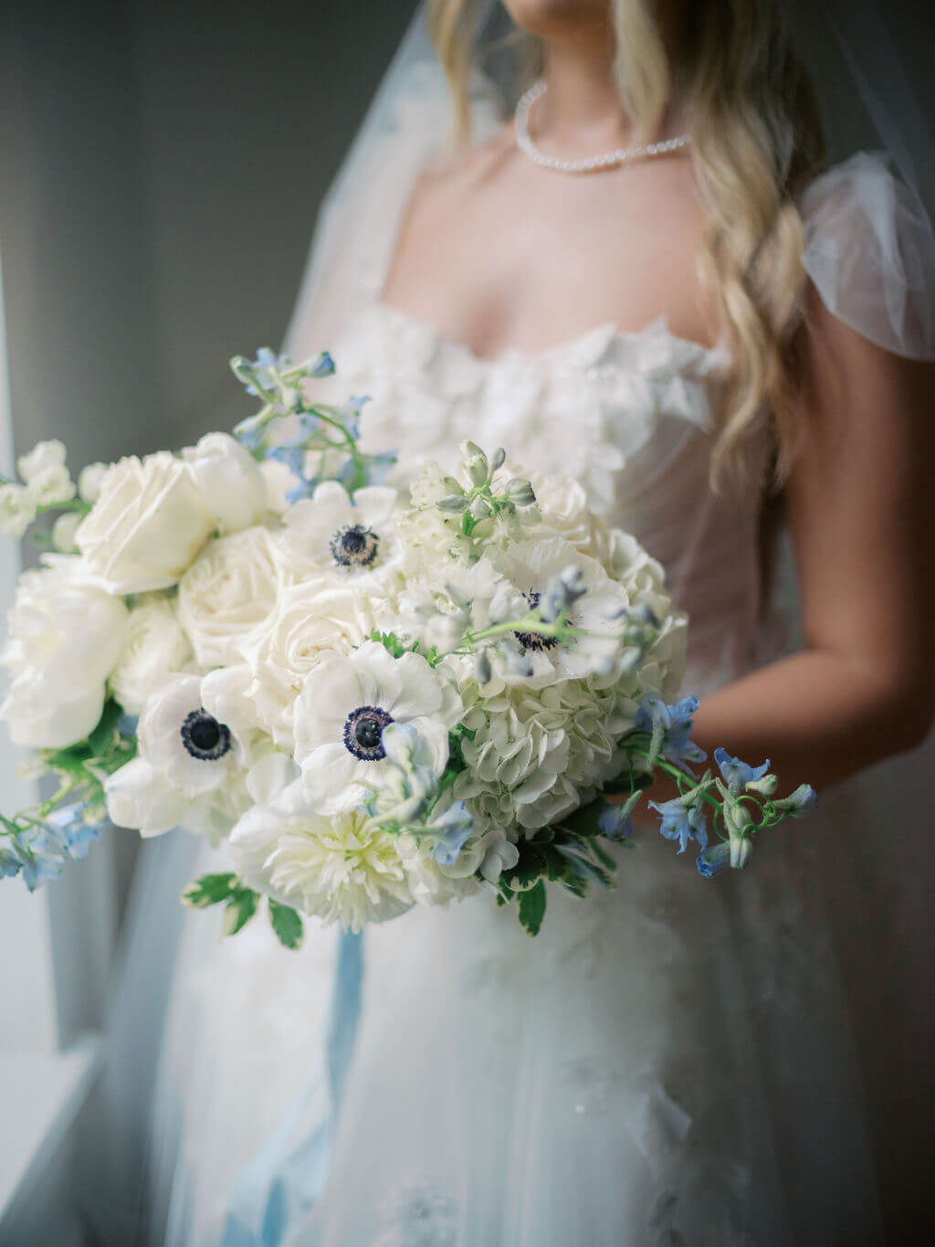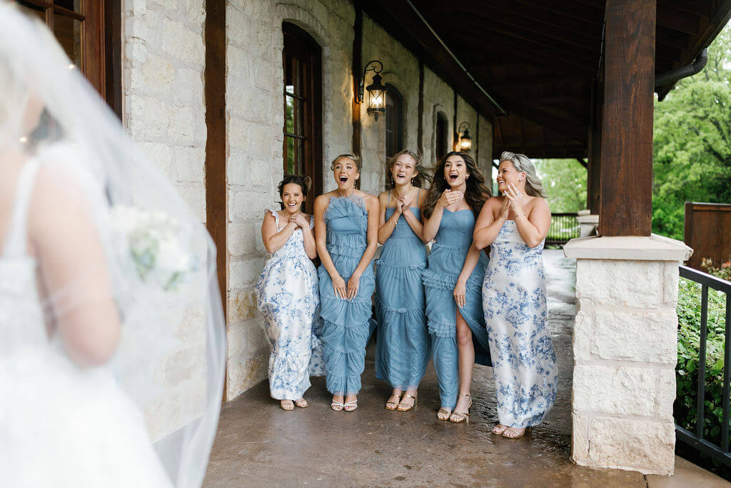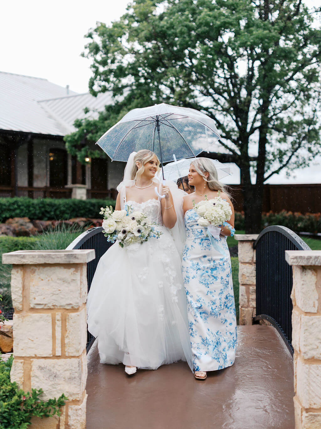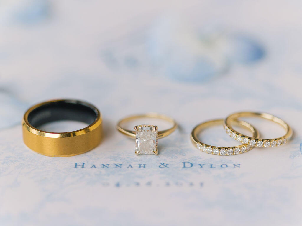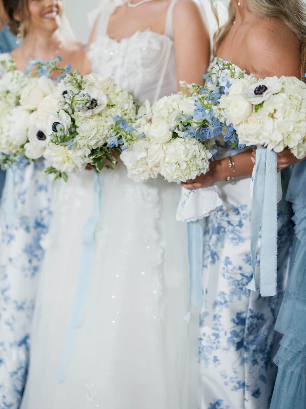 When it came time to start planning, Hannah leaned fully into the experience, drawn to every detail from the very beginning. Aurora Grove at The Springs in Norman was the first and only venue they toured, and it felt immediately like it was the place for them. The space reflected both of their personalities and the rest fell into place with ease. Hannah found her gown at Chantilly, and together they had already chosen rings that felt true to them. Their vision took shape around a French-inspired aesthetic, something soft and romantic, grounded in spring. Shades of blue layered with white and gold created a palette that felt both refined and whimsical.