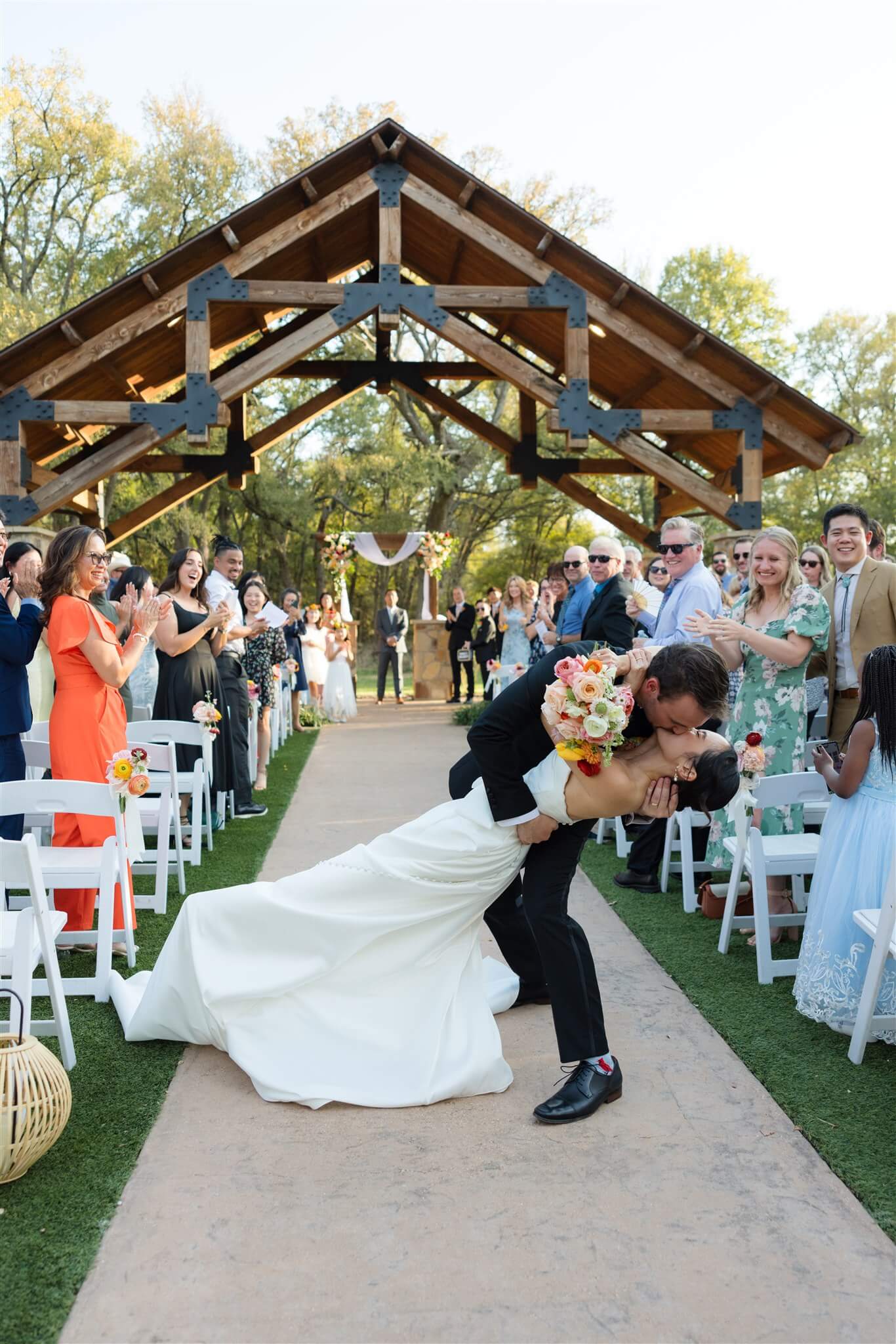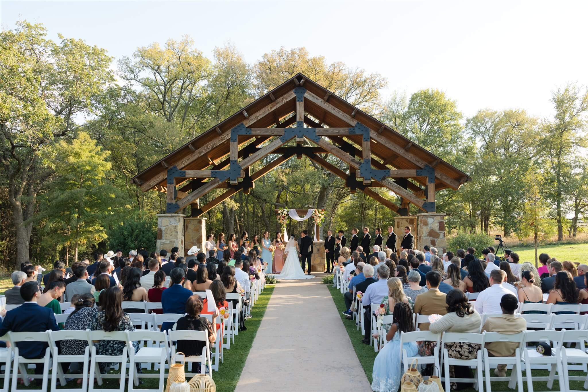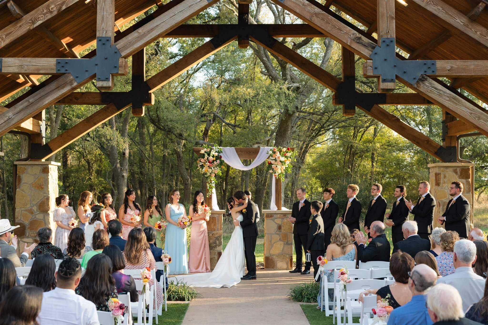 Set beneath the trees in at The Springs in Alvarado’s Timberview Lodge, The Ploosters’ wedding day unfolded across a venue designed for both outdoor ceremonies and indoor receptions, allowing each moment to move with ease. The aisle, framed by natural greenery and a wood-beamed pavilion led to a floral-adorned altar where vows were exchanged in soft, open light. Bright, seasonal florals added warmth throughout, bringing color to the landscape without overpowering it. As the evening shifted indoors, the reception space introduced a more intimate atmosphere, where exposed wood interiors and ambient lighting carried the celebration into the night. Take a look at this stunning wedding and save for your spring or summer wedding inspo.
